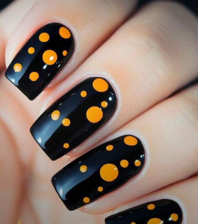 A bold black base is decorated with bright orange polka dots of varying sizes, giving the nails a playful yet edgy Halloween-inspired vibe.