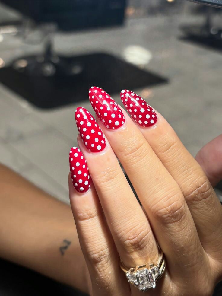 Bold red nails with crisp white polka dots for a fun, retro vibe.