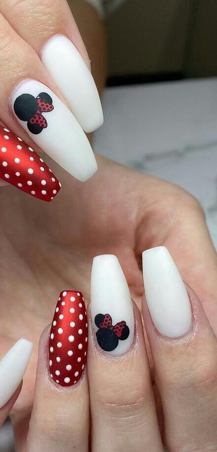 White and red nails with polka dots and bow accents, giving a cute Disney-inspired style.