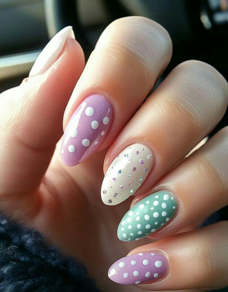 Pastel purple, green, and cream nails decorated with bold white dots and tiny glitter accents, like candy sprinkles on frosting.