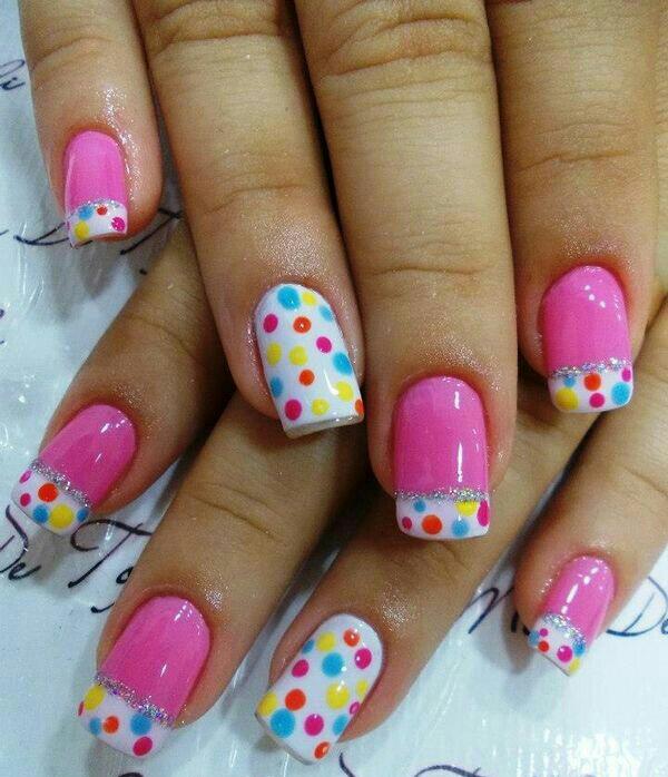 Pink nails paired with multicolored dots and white tips, creating a cheerful, candy-like finish.