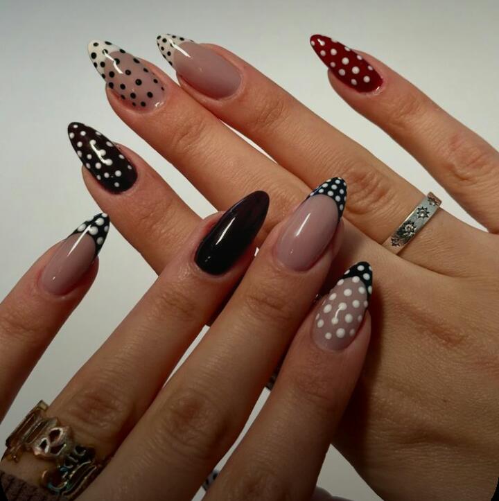 A mix of nude, black, and red tones with dotted French tips and some nails covered entirely, blending classic polka dots with modern variety.