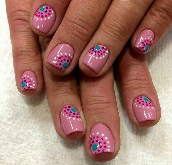 Soft pink nails decorated with bursts of colorful dots in white, purple, and teal for a cheerful, artsy style.