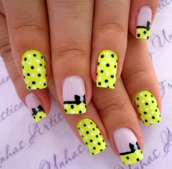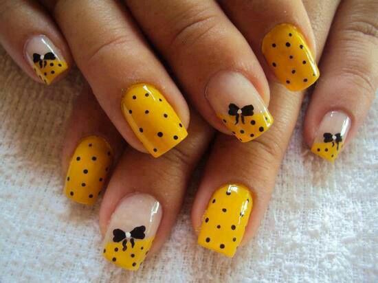 Vibrant yellow nails paired with black dots and bow details for a playful, retro-inspired design.
