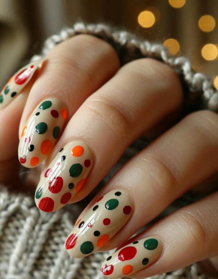 Neutral beige nails covered in bold red, green, orange, and black dots for a playful yet chic holiday-ready vibe.