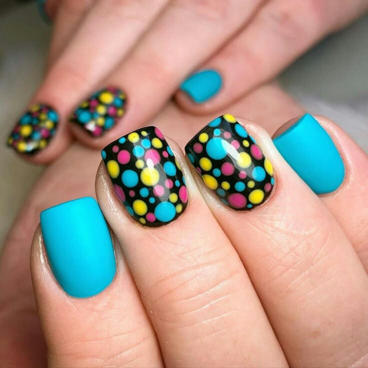 A mix of solid turquoise nails and black bases filled with bright neon polka dots, giving a fun and lively party look.