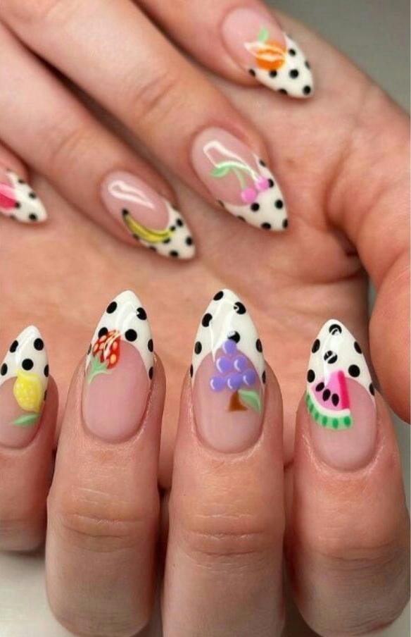 White polka-dotted tips paired with colorful fruit art on a nude base, creating a quirky and fresh summer feel.