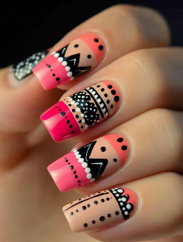 Bold pink and nude nails decorated with black and white dotted tribal-style patterns for a modern, edgy twist.