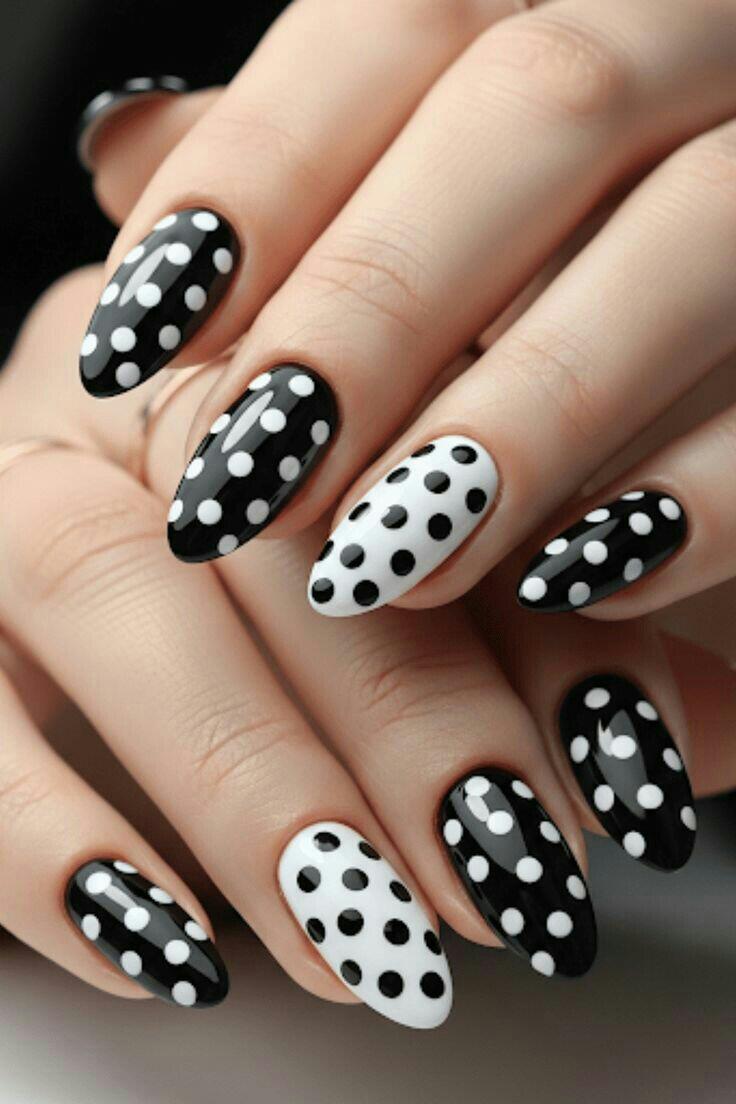 Sharp black-and-white nails with bold contrasting polka dots for a timeless, chic look.