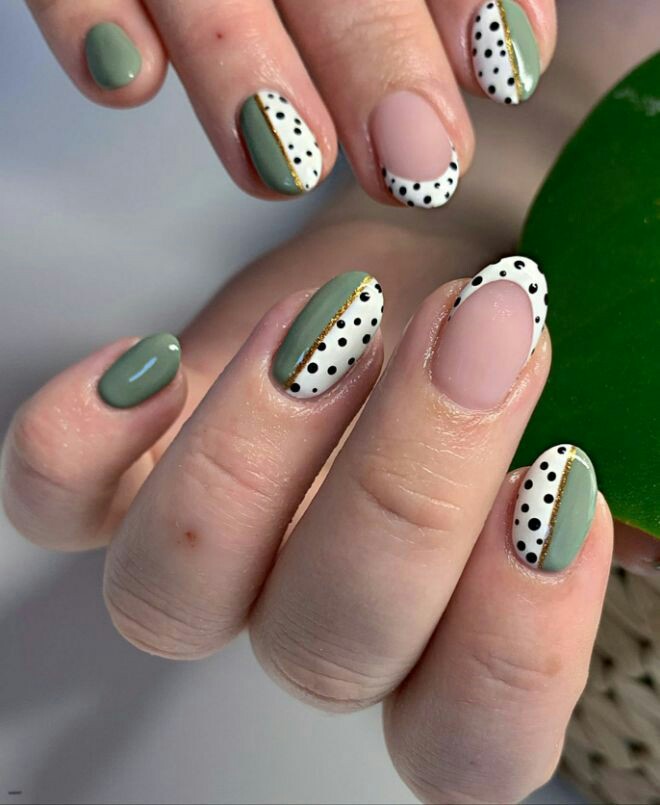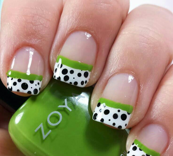 Classic French tips reinvented with green stripes and black polka dots over white, offering a clean yet playful style.