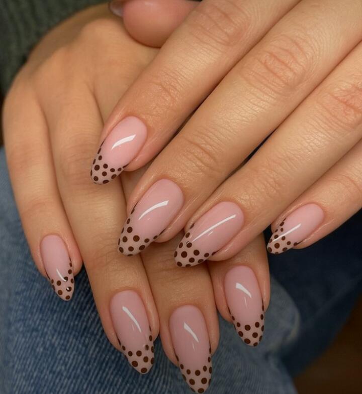 Soft nude nails with brown polka-dotted French tips for a modern and elegant twist on the classic style.