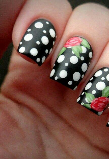 Black matte nails with white polka dots accented by hand-painted roses, blending playful patterns with a feminine touch.