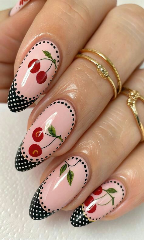 Soft pink nails with black polka-dot accents and cherry art, paired with dotted French tips for a cute and retro-inspired style.