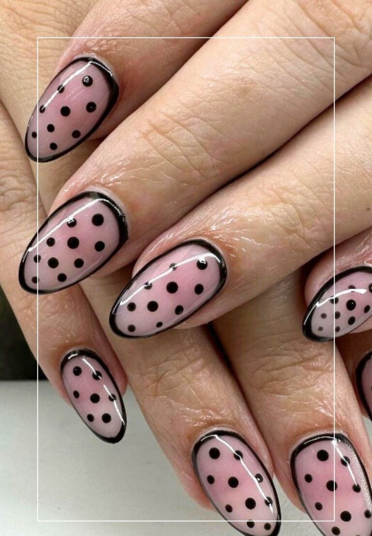 Pink nails with bold black polka dots and sharp black outlines, offering a modern, edgy twist on the traditional dot design.