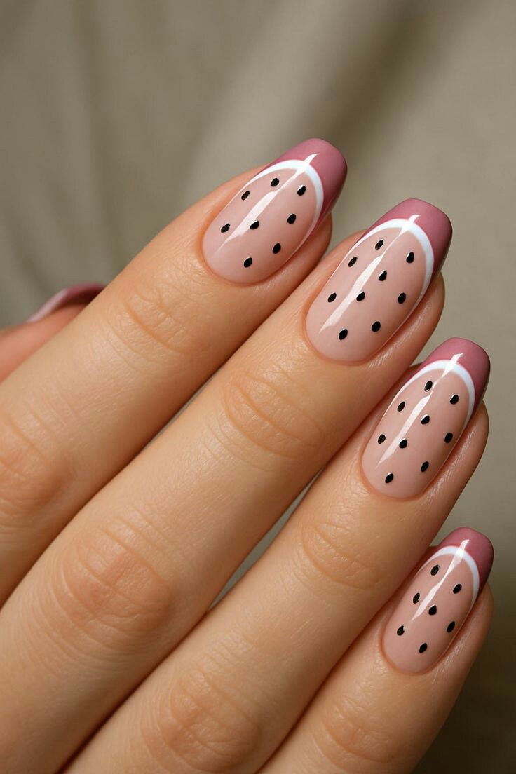 Soft nude nails with a pink tip and scattered black dots, resembling juicy watermelon slices with seeds.