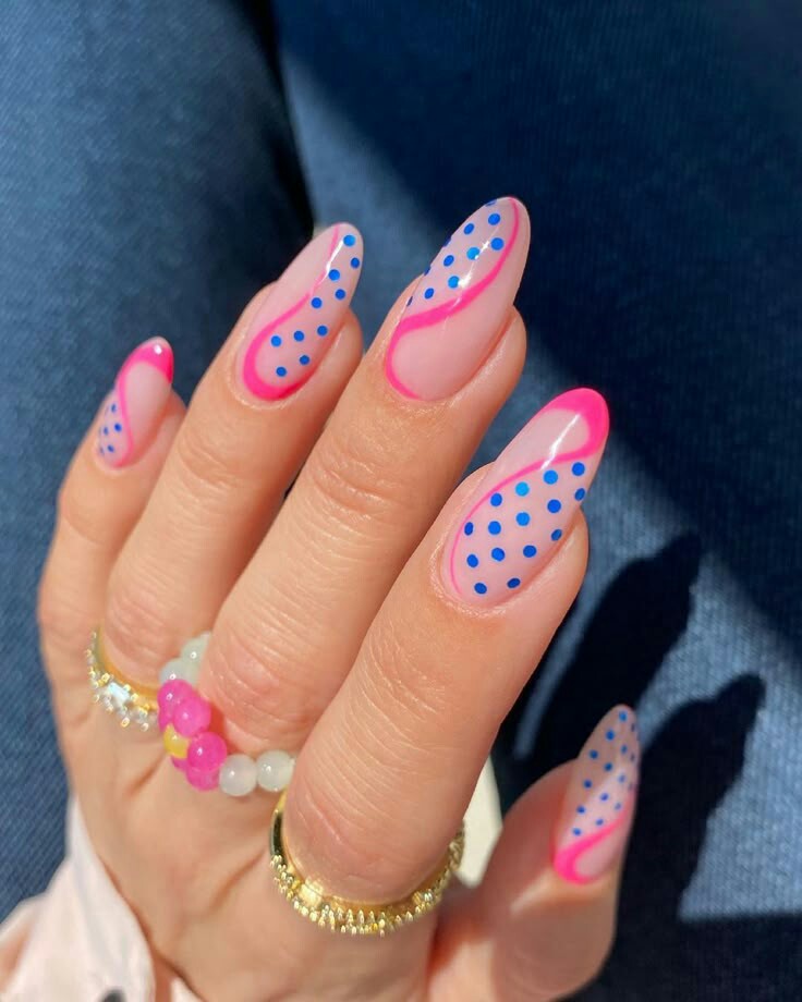 Playful swirls of hot pink paired with bold blue dots on a sheer base, giving a bright, modern pop-art vibe.