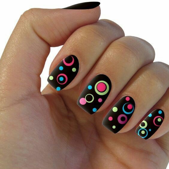 Glossy black nails decorated with vibrant neon circles in pink, blue, green, and yellow, giving a bold, cosmic look.
