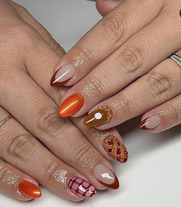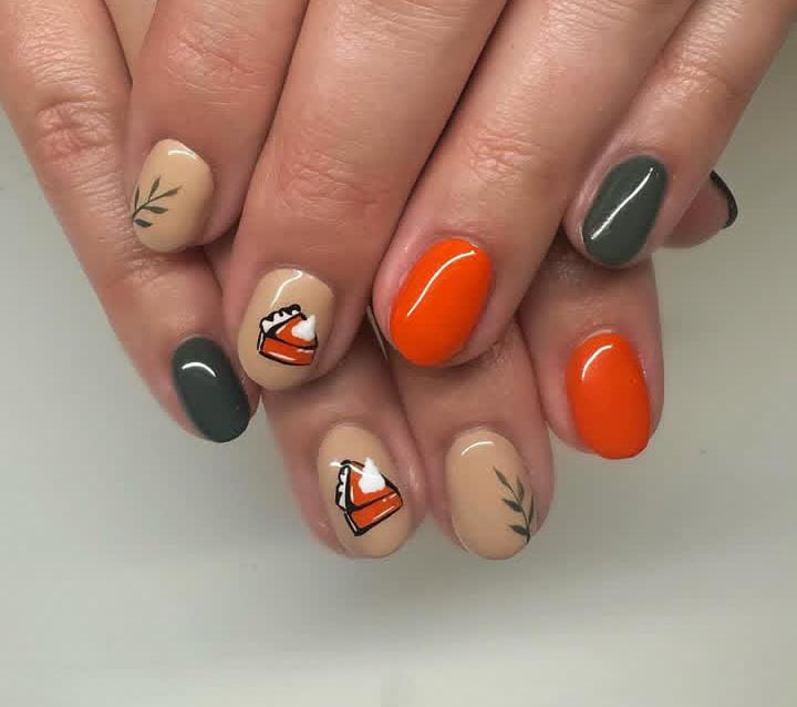 A cozy mix of burnt orange, beige, and deep green, highlighted with cute pumpkin pie slices and leafy accents that feel like Thanksgiving on your nails.