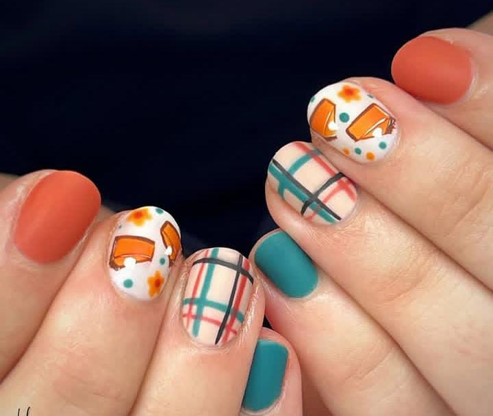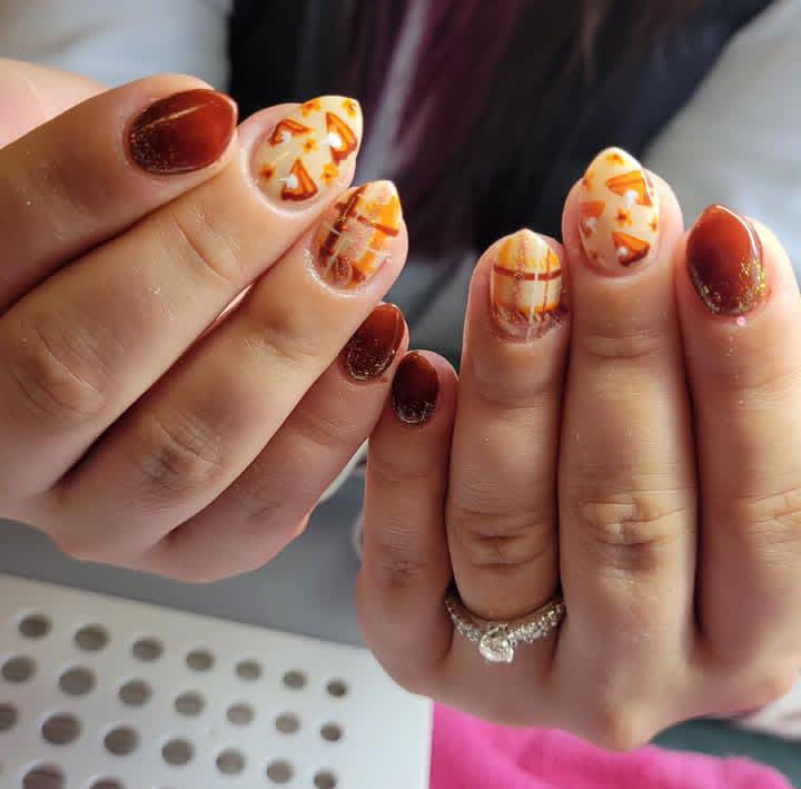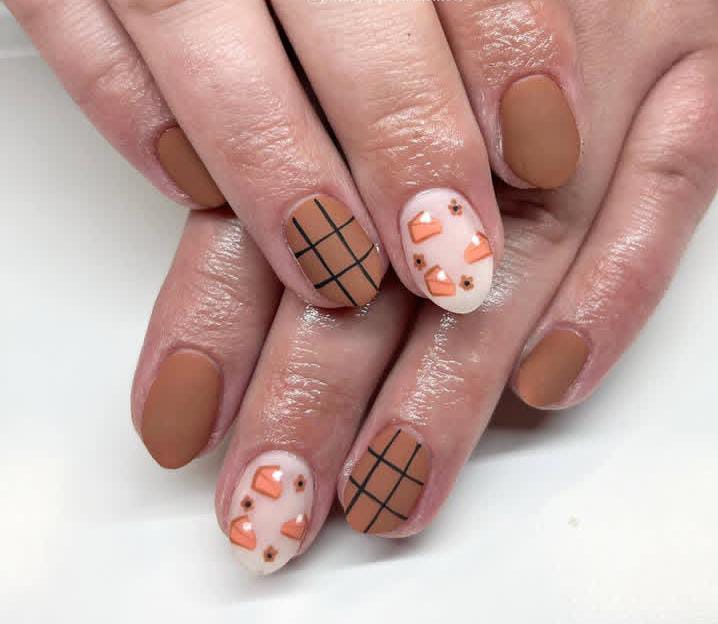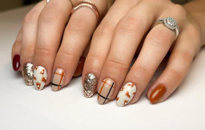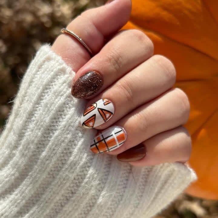 Deep brown and cream-toned nails with orange plaid and leaf-like accents, perfectly blending rustic fall charm with pumpkin-pie coziness.