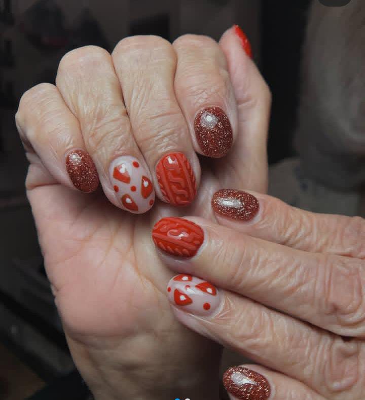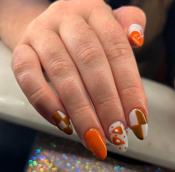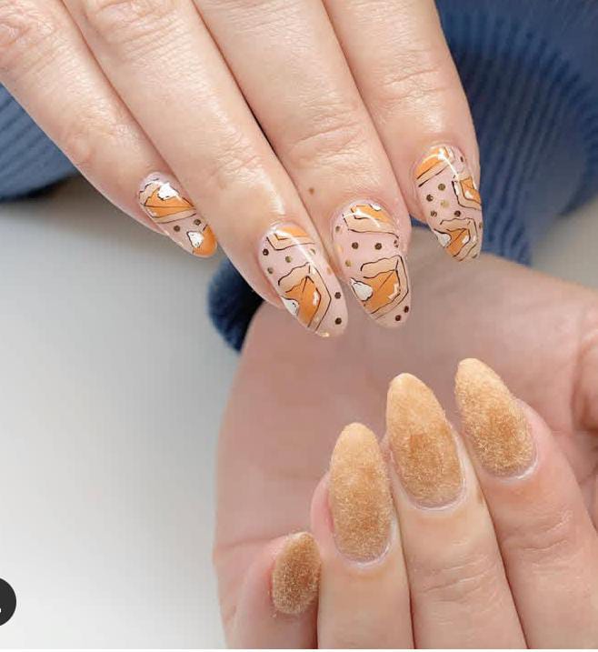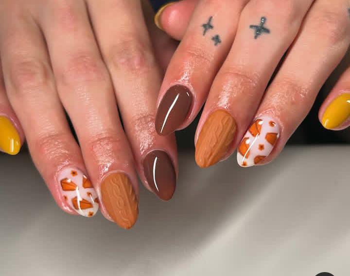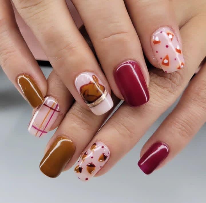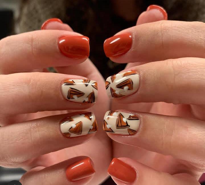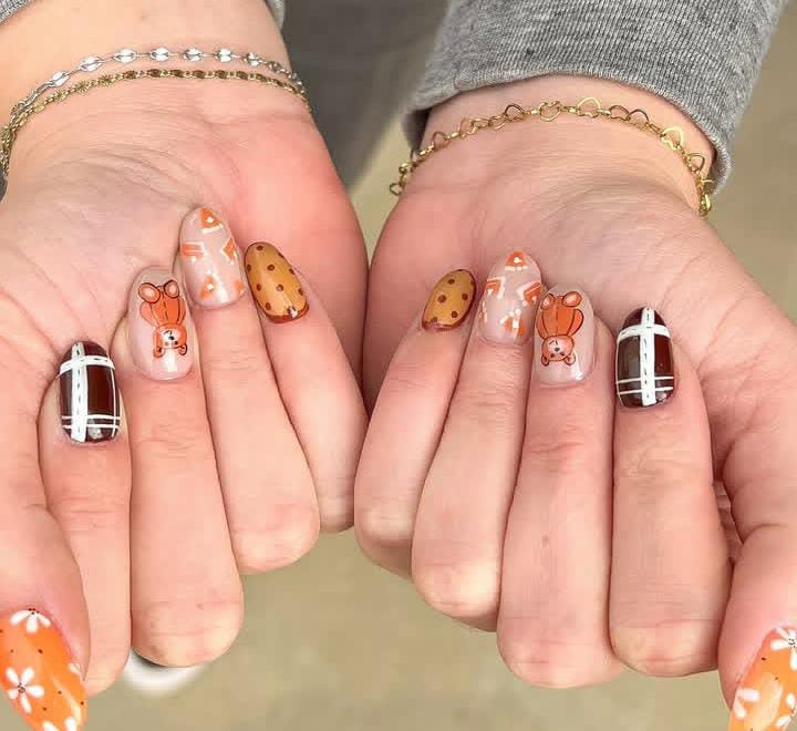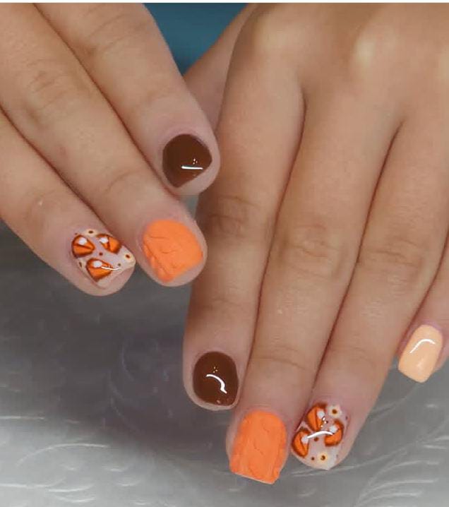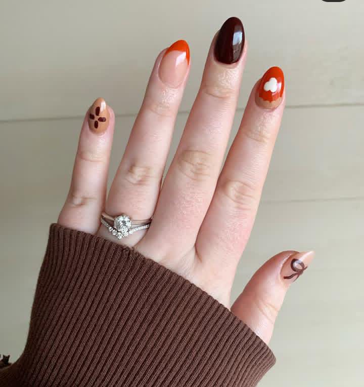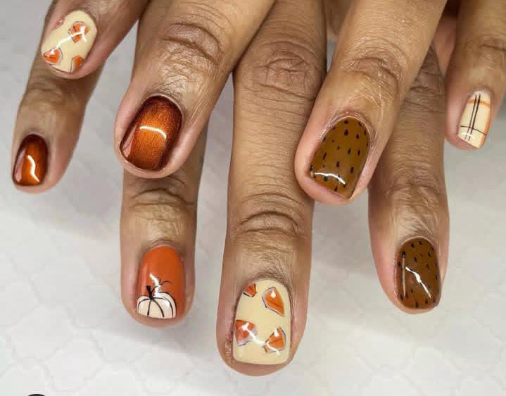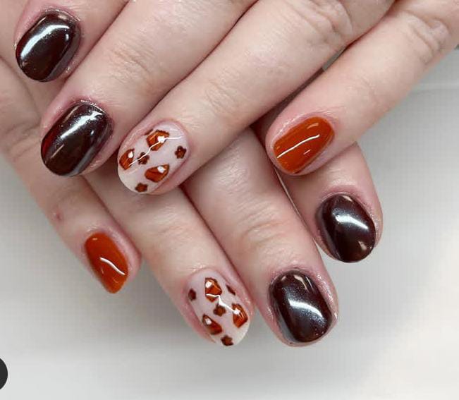 Deep chocolate brown and burnt orange alternate with a soft nude base dotted in pumpkin pie. The mix feels chic yet playful, like sipping cocoa by a fire in October.