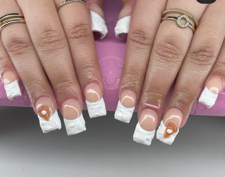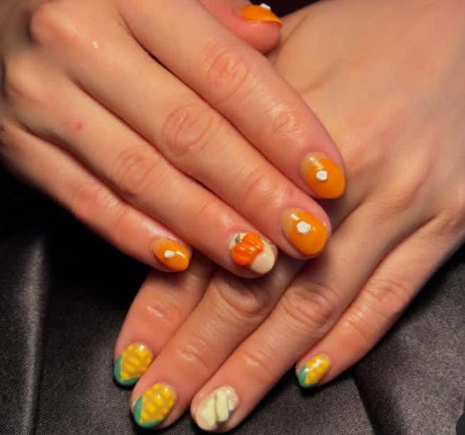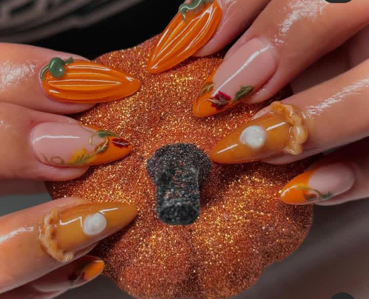 This look mixes bold orange French tips with playful pumpkin pie slice accents, creating a bright and cheerful vibe perfect for autumn.