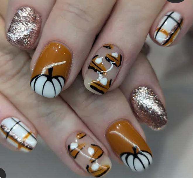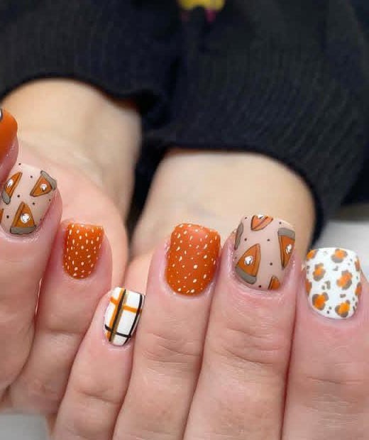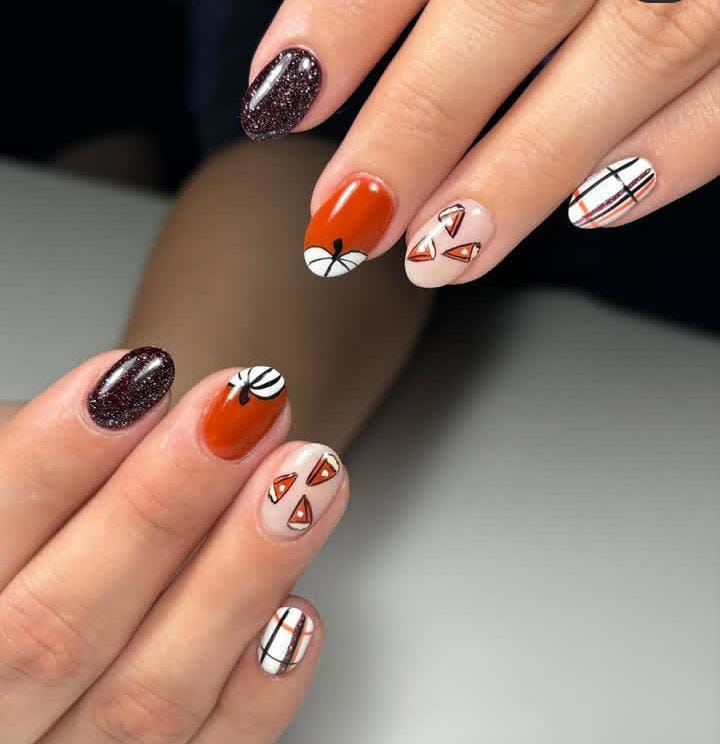 A bold mix of chocolate brown glitter, orange pumpkin pie, and crisp plaid lines creates a playful candy-corn inspired design.