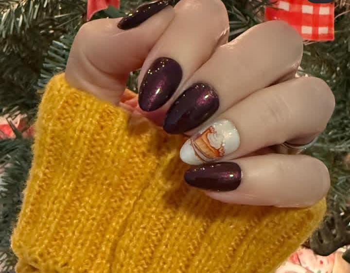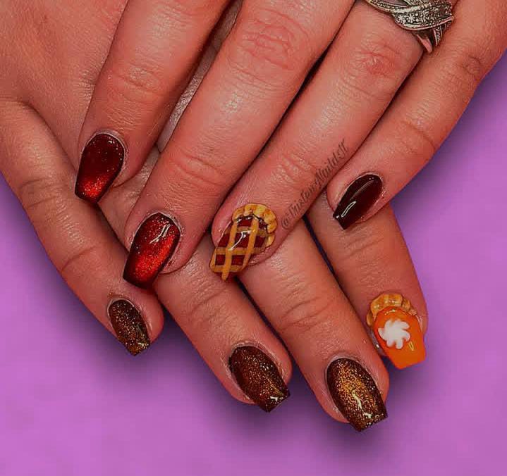 Dark shimmery nails with accents of golden crust and a creamy pie slice stand out, creating a glamorous yet festive twist on pumpkin pie season.