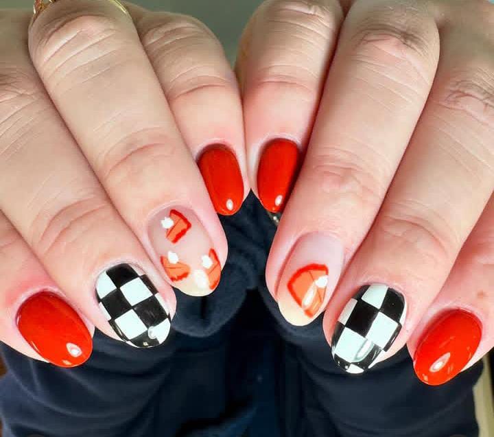 A bold mix of bright orange polish with playful black-and-white checker accents and tiny pumpkin pie slices, giving a festive and fun fall-inspired vibe.
