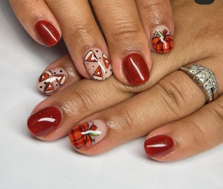 Deep autumn reds paired with cute pumpkin art and candy corn-inspired pie slices bring a cozy, seasonal farmhouse feel to the nails.