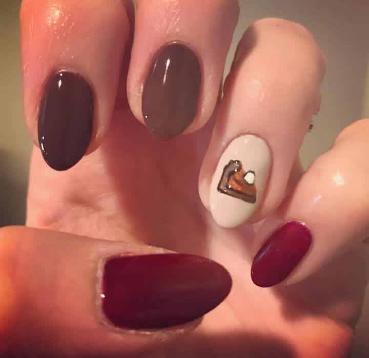 Rich shades of brown and burgundy frame a simple accent nail featuring a tiny pumpkin pie slice, perfectly evoking Thanksgiving comfort.