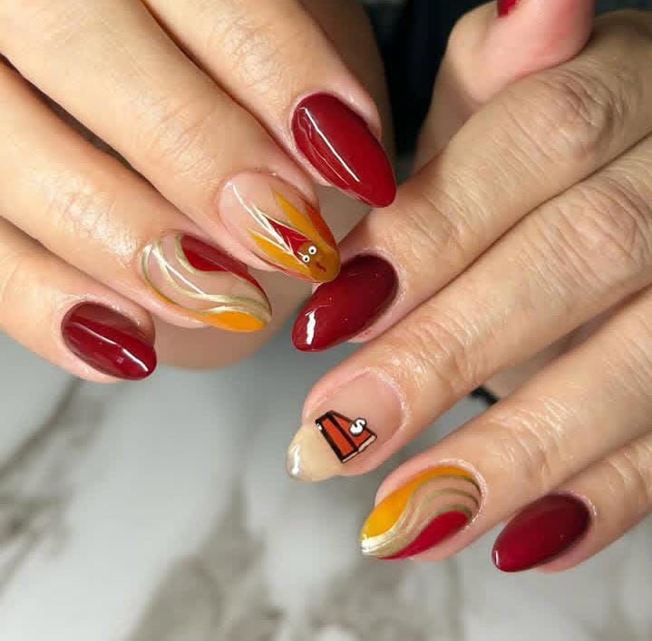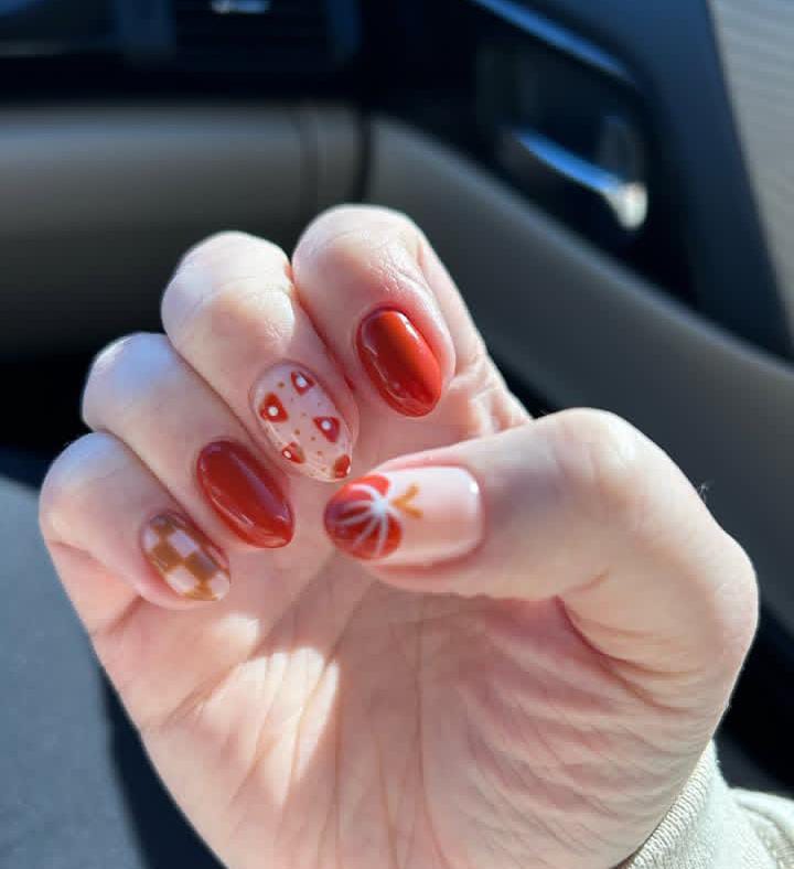 Classic autumn reds are brightened with accent nails showing mini pumpkin pies and rustic checkerboard patterns, blending warmth with festive charm.