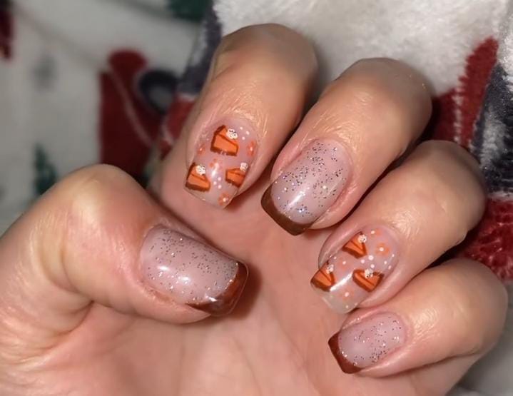A soft nude base with glitter accents and tiny pumpkin pie slices creates a playful yet cozy fall look, balanced by rich brown French tips.