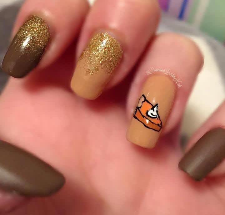 Warm golden-brown nails with shimmering glitter pair beautifully with a single pumpkin pie accent nail, giving a festive and decadent vibe.
