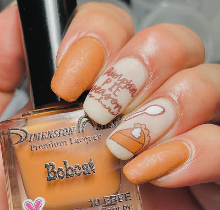 Pumpkin-hued nails with cream accents feature detailed pie slice art and script, celebrating the classic fall dessert in a fun, hand-painted style.