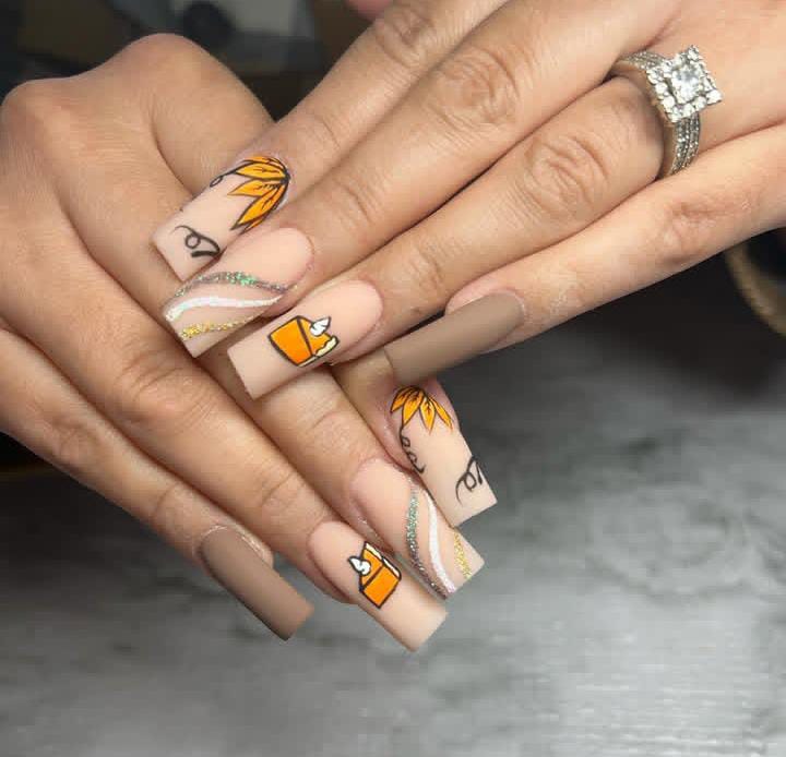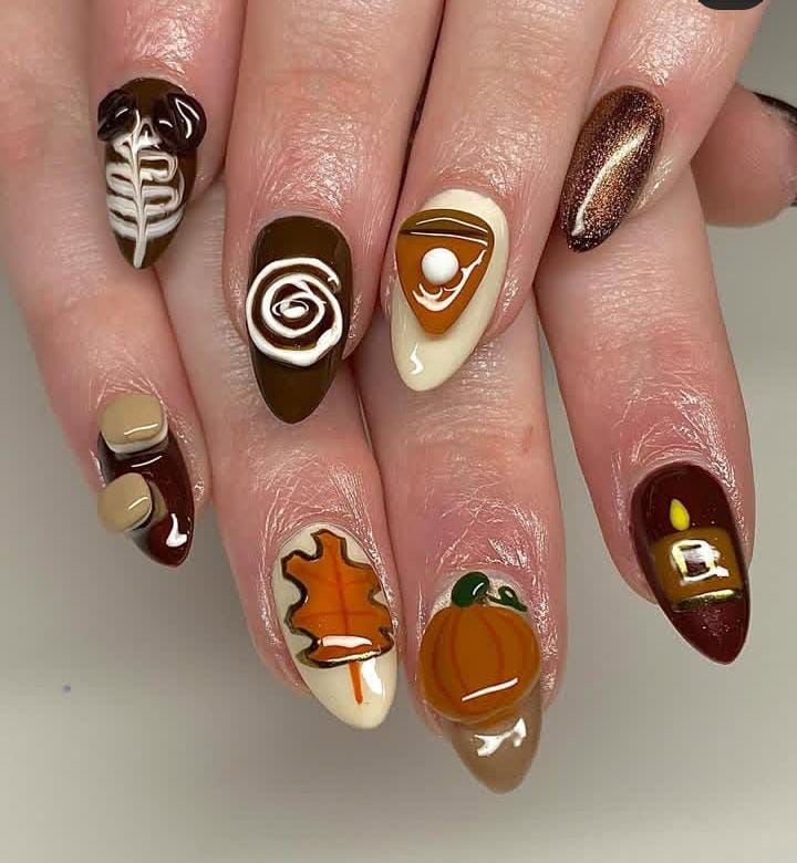 A mix of shimmery copper, earthy brown, and cream with scattered pie slices and a bold pumpkin sketch — a true autumn treat for the nails.