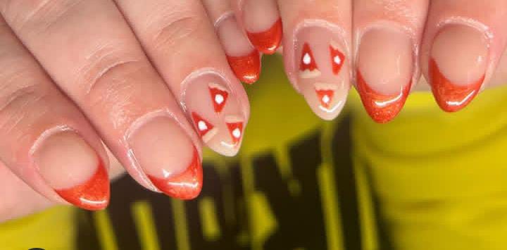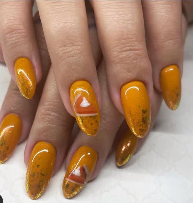 Sharp almond nails with bold orange tips and playful pie slice–inspired accents, giving a sweet yet spooky Halloween vibe.