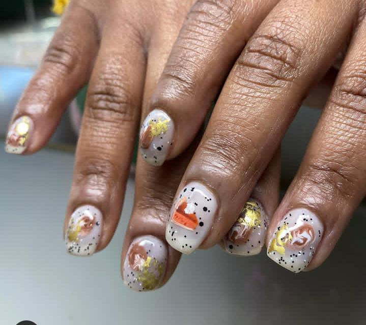 Neutral nails sprinkled with gold foil, speckles, and tiny pumpkin pie, for a cozy fall look that feels festive and artsy.
