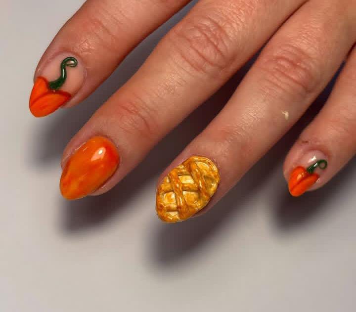 Pumpkin-shaped tips paired with a golden lattice accent nail, mimicking the crust of a pie — perfect for a delicious fall-inspired design.