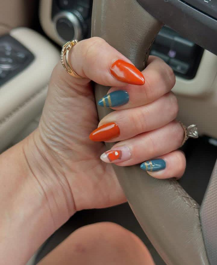 A bold combination of burnt orange and teal nails with golden accents, giving a warm yet modern fall vibe that feels both chic and seasonal.