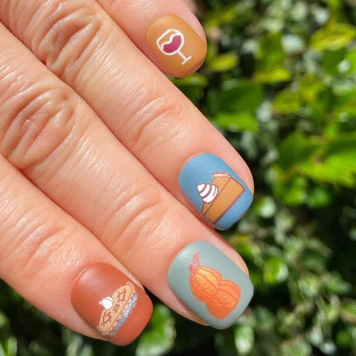 Cute matte nails featuring pumpkins, pie slices, wine glasses, and little details bring out the playful, festive side of Thanksgiving desserts.