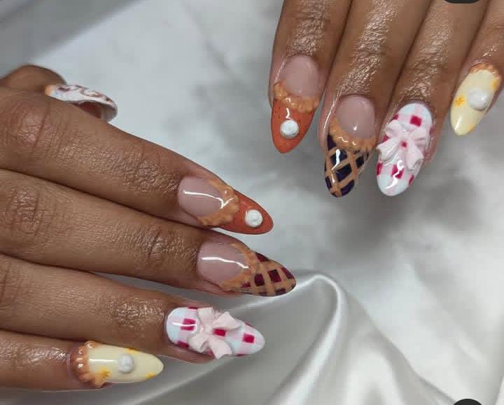 Glossy nails styled with crisscross crust edges and dollops of cream look like miniature pies, blending fun food art with chic nail fashion.