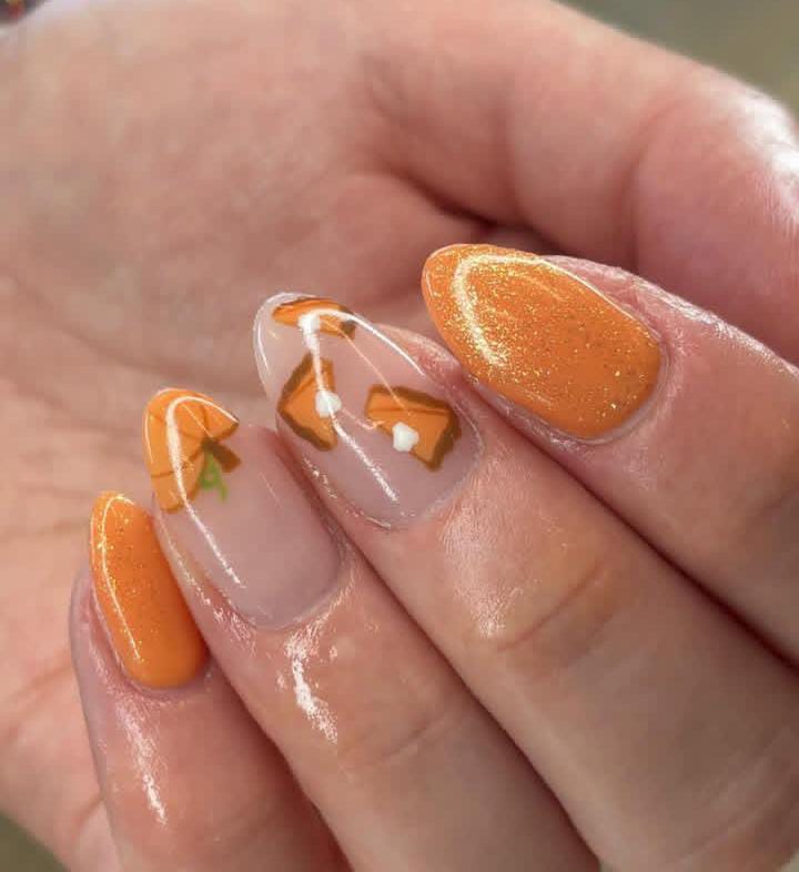 Featuring shimmery orange polish paired with clear nails decorated in pumpkin slice art, this design gives off a cozy fall sparkle.