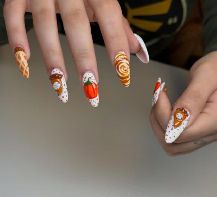 With swirling orange-and-white backgrounds, pumpkin art, and slices of pie, this playful set looks like a festive dessert table on your nails.