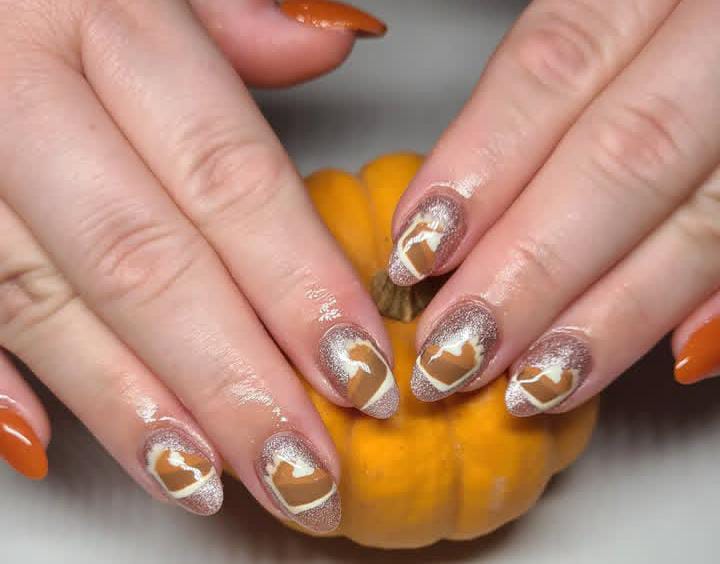 Shimmering silver bases meet soft pumpkin pie, for a sweet and playful design. Paired with solid burnt-orange nails, it captures the cozy glow of fall evenings.