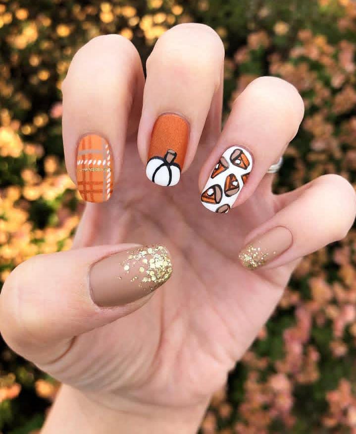 A bold mix of chocolate brown glitter, orange pumpkin pie, and crisp plaid lines creates a playful candy-corn inspired design.