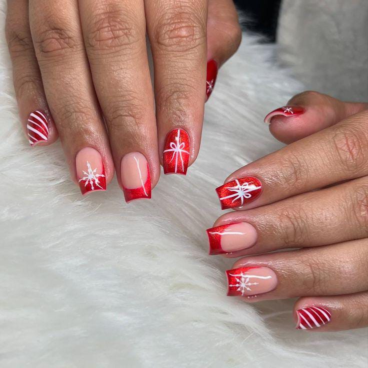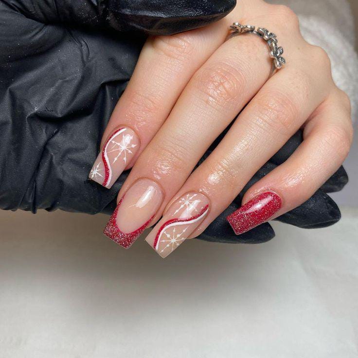 This design mixes soft nude bases with bold red glitter tips, accented by white snowflakes and curved lines for a festive, candy-cane-inspired winter look.