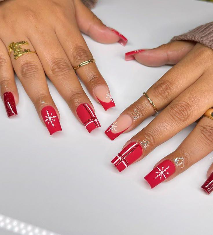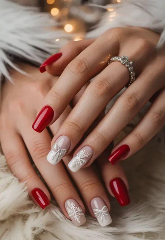 Bold red nails are paired with soft nude and white accents featuring shimmering bows and snowflakes, giving the whole set a wrapped-present, holiday-celebration vibe. It’s elegant yet playful, perfect for winter festive occasions.
