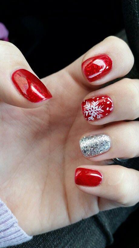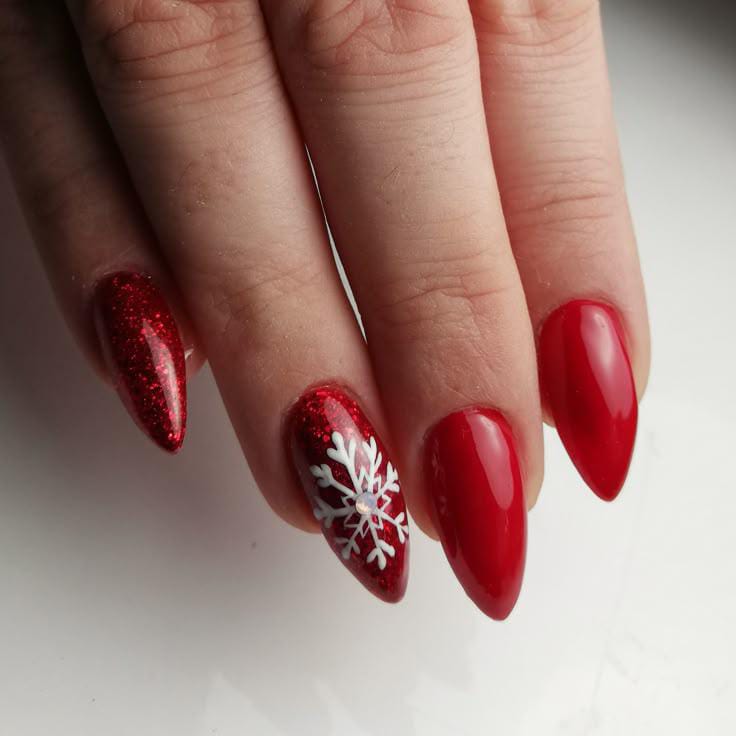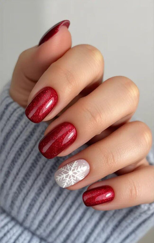 This look mixes classic glossy red nails with a bold silver-glitter accent and a single red nail featuring a delicate white snowflake, giving it a cheerful and simple winter vibe.