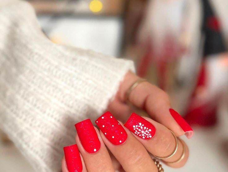 Bright red nails get a playful winter upgrade with dotted “snow” and a simple white snowflake accent. It’s a clean, cozy, sweater-weather design that feels festive without being overly detailed.