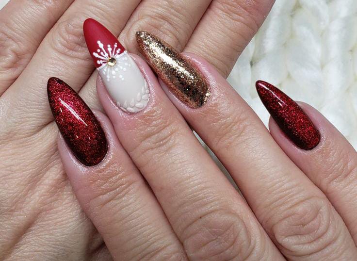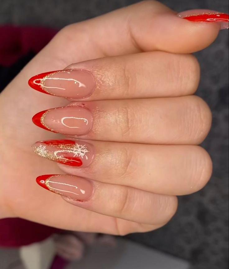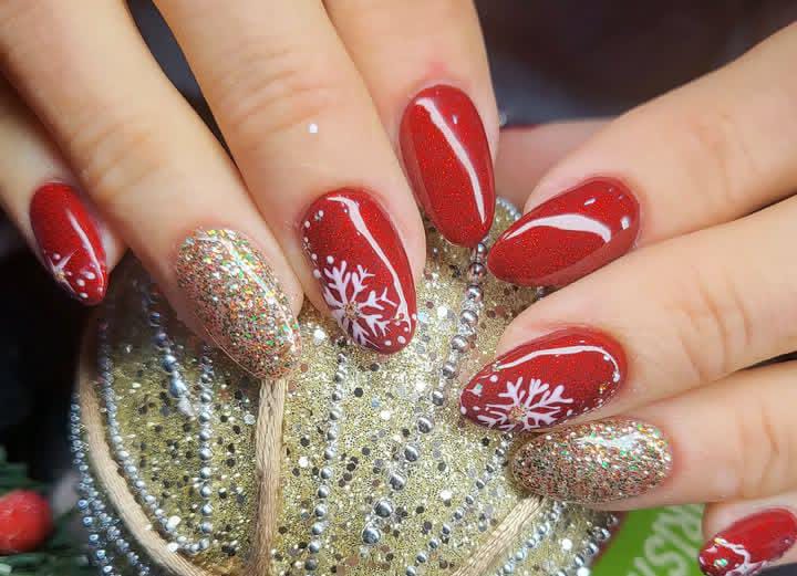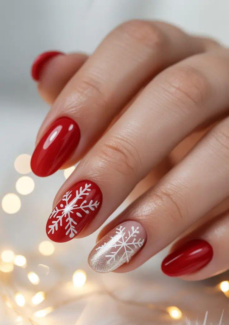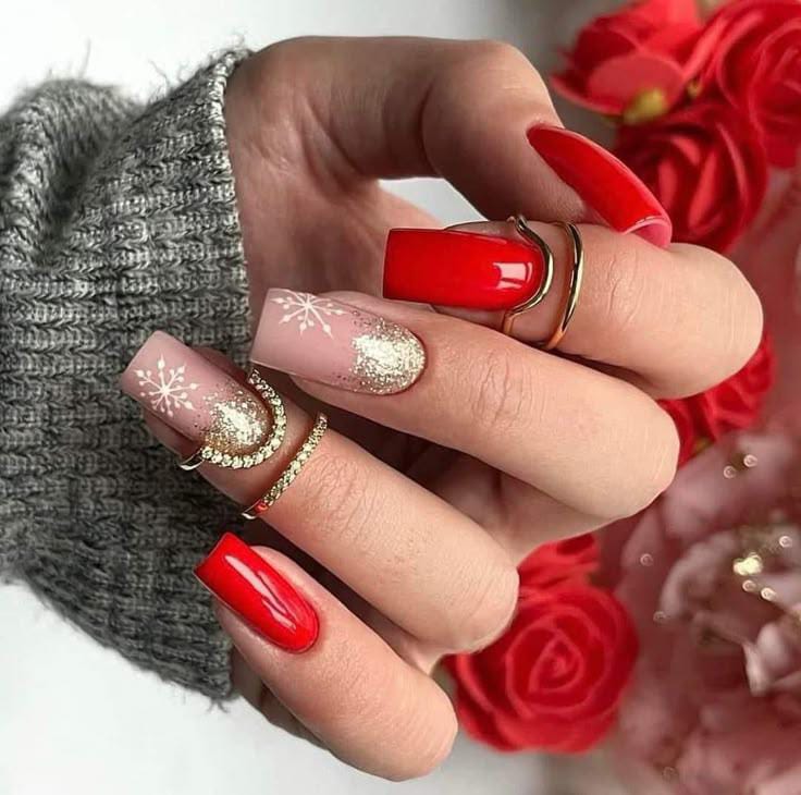 This manicure blends glossy red nails with nude-and-gold glitter accents and subtle white snowflakes for a luxurious holiday feel. The mix of shimmer and classic red gives it a warm, glowing winter charm.